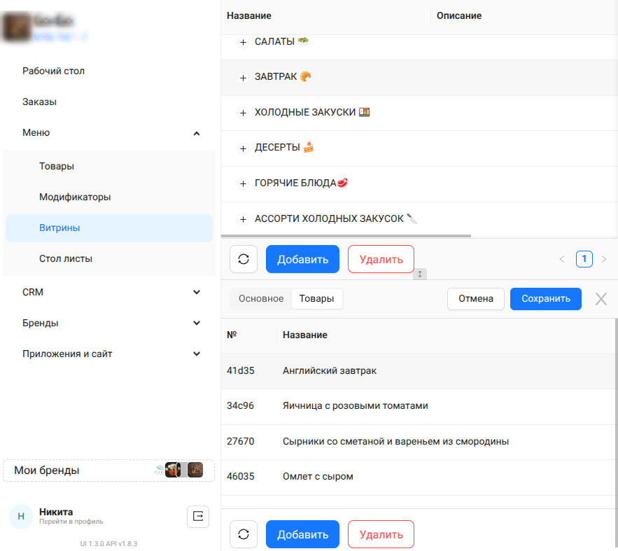Витрины: управление товарами и категориями