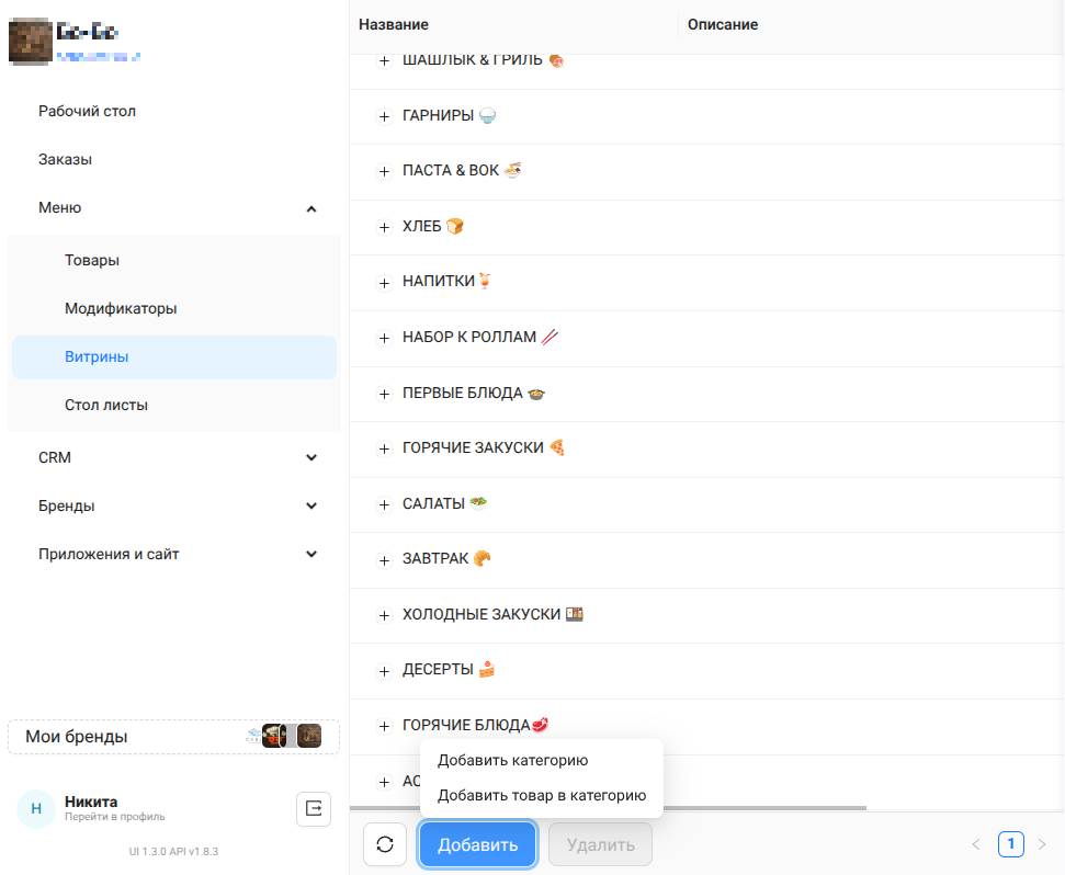 В YBRU.Меню витрины — это гибкий инструмент для организации товаров и их отображения в различных каналах продаж. Витрина представляет собой набор товаров и категорий, которые можно настроить отдельно для сайта, мобильного приложения, Telegram Mini App или VK. Это позволяет показывать разный ассортимент в зависимости от платформы, сезона или маркетинговых кампаний.