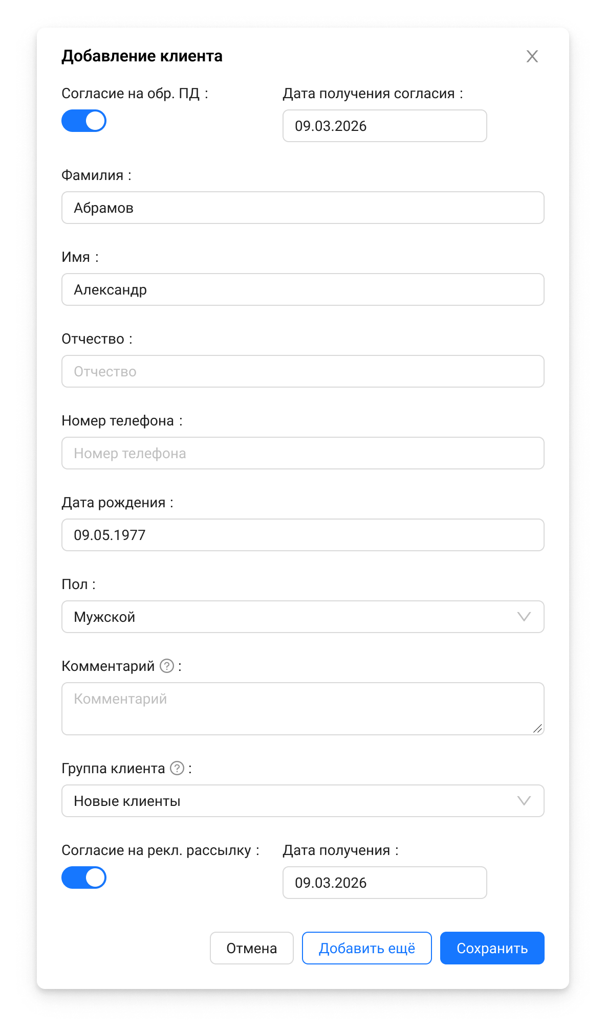 «Добавить ещё» – сохраняет текущего клиента и сразу открывает пустую форму для создания следующего. Удобно при массовом вводе данных.